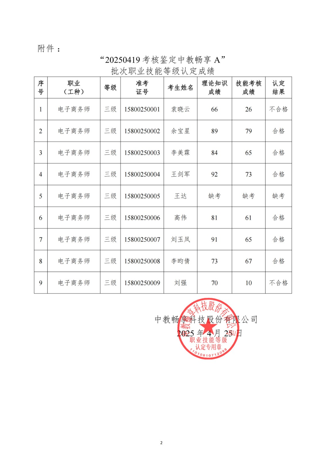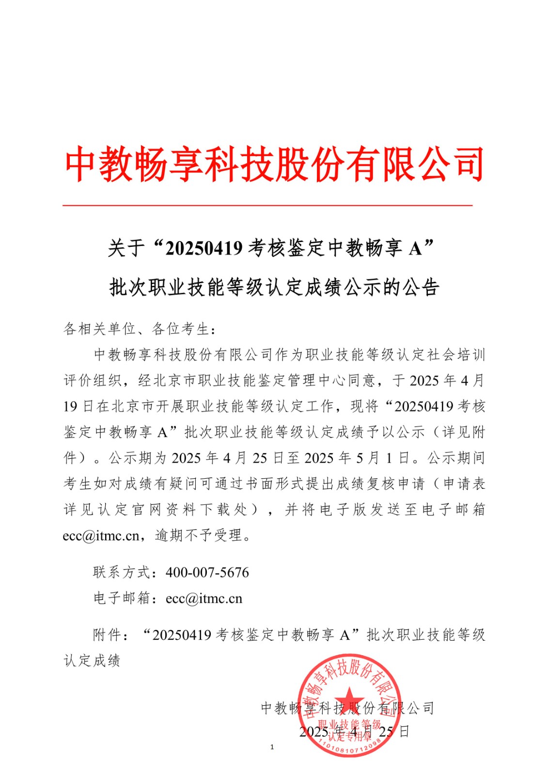 关于“20250419考核鉴定中教畅享A”批次职业技能等级认定成绩公示的公告