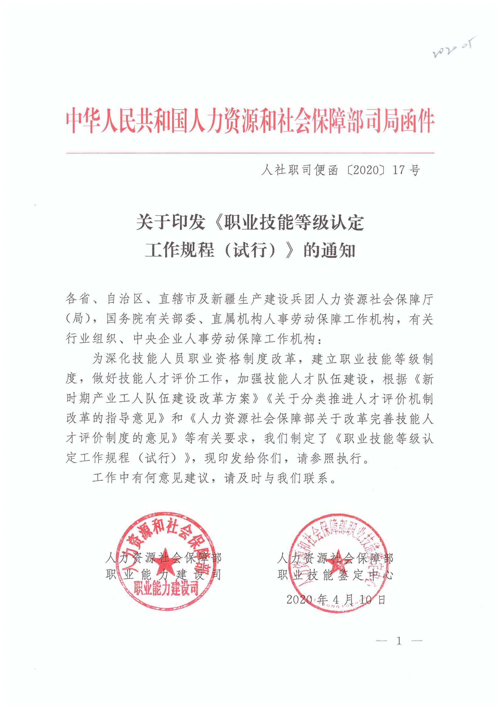 关于印发《职业技能等级认定工作规程(试行)》的通知