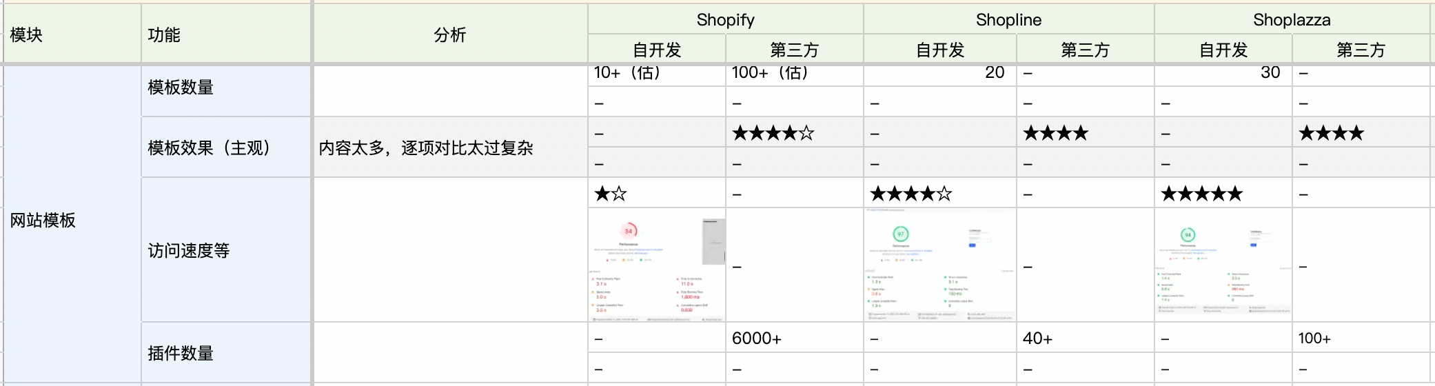网站速度:值得一提的的是,在Google网站速度测试中(https://pagespeed.web.dev,Google测速网站)中,Shopify的评分远低于Shopline、Shoplazza(实际体验Shopify的网站加载速度确实比较慢,特别是在装了多个插件后,该网站的速度会更慢)