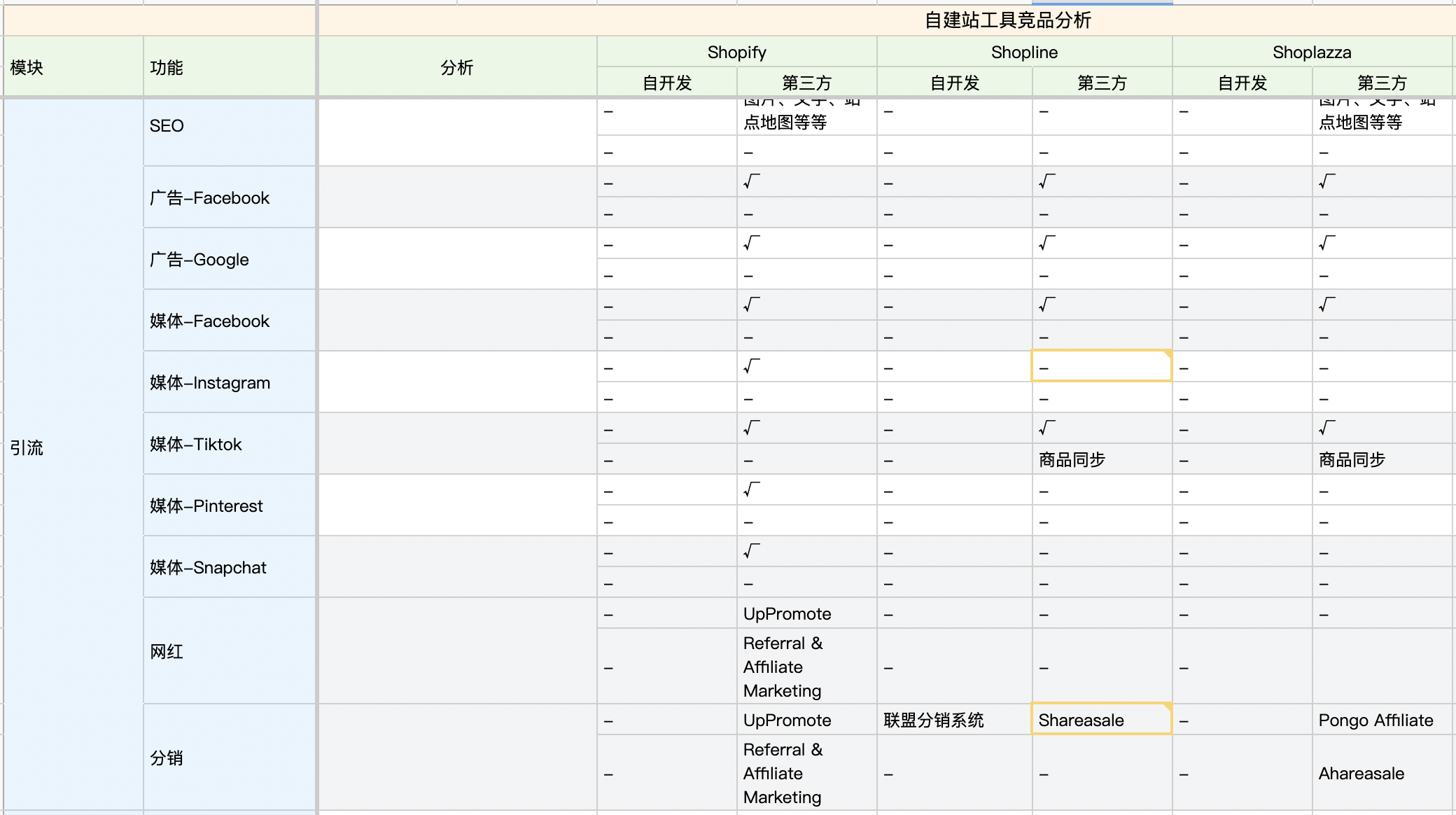 Shopline及Shoplazza在连接营销渠道上处于劣势,比如都缺少了Instagram、Pinterest的产品同步功能,在网红及分销上的功能都不尽如人意。但在资源有限的情况下,考虑到渠道的重要性,先满足重要渠道如Facebook Ads、Google Ads的连接,也是有道理的。