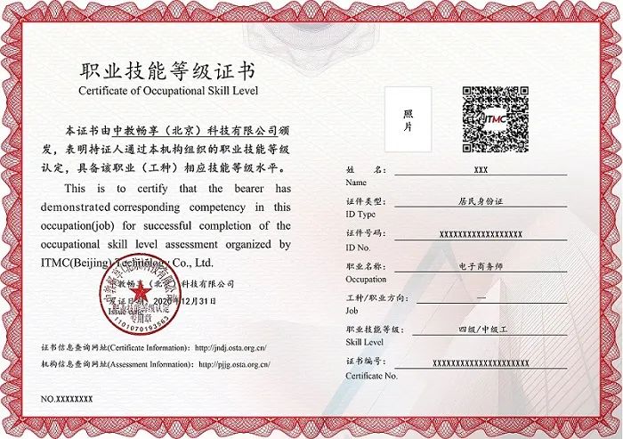 2020年2月26日,人力资源和社会保障部职业技能鉴定中心发布《关于持续征集社会培训评价组织的通告》,面向全社会征集社会培训评价组织,开展职业技能等级认定试点工作。经自主申报、专家遴选、信用核查、注册地人力资源和社会保障部门实地考核及征求社会各方面意见等程序,中教畅享(北京)科技有限公司成功入选首批职业技能等级认定第三方评价机构名单,面向“电子商务师”职业(工种)开展评价试点工作。在北京、广州考点已开展多个批次的电子商务师二级、三级、四级认定考试。