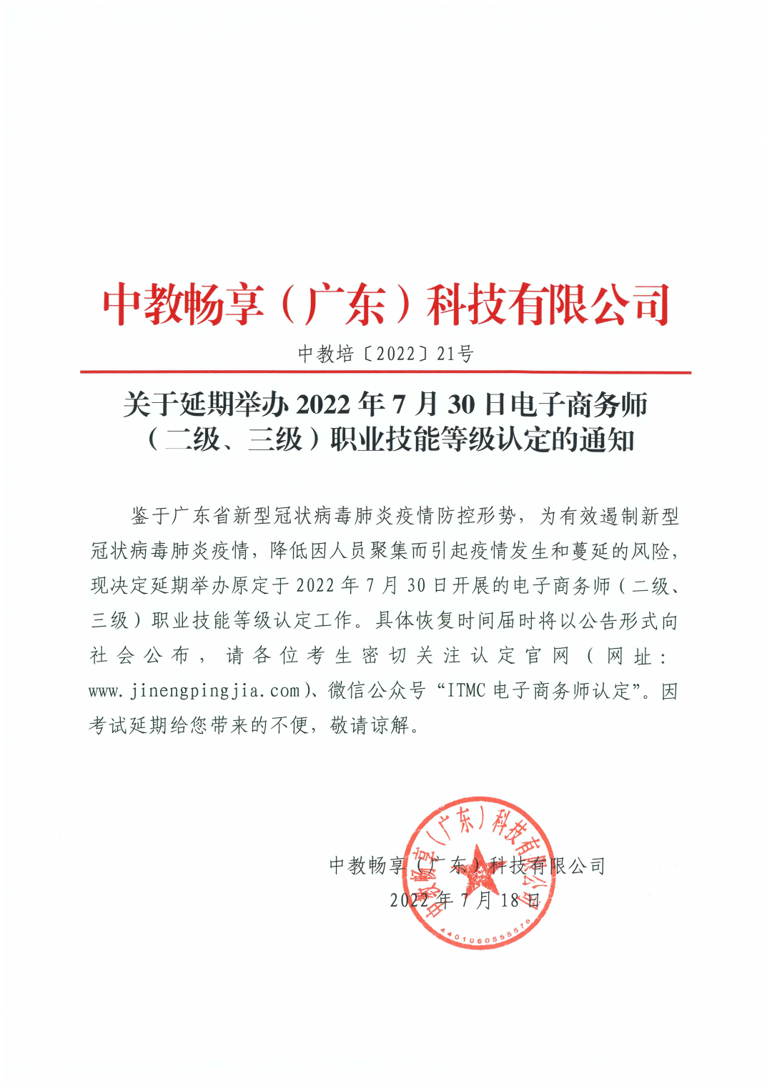 鉴于广东省新型冠状病毒肺炎疫情防控形势,为有效遏制新型冠状病毒肺炎疫情,降低因人员聚集而引起疫情发生和蔓延的风险,现决定延期举办原定于2022年7月30日开展的电子商务师(二级、三级)职业技能等级认定工作。具体恢复时间届时将以公告形式向社会公布,请各位考生密切关注认定官网(网址:www.jinengpingjia.com)、微信公众号“ITMC电子商务师认定”。因考试延期给您带来的不便,敬请谅解。