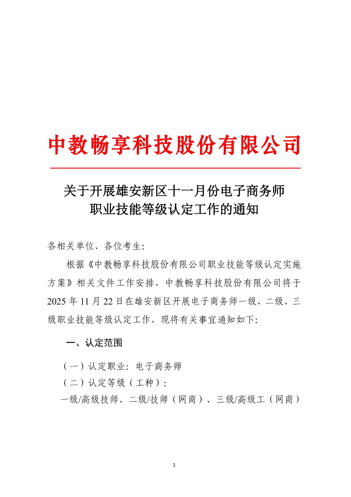 关于开展雄安新区十一月份电子商务师职业技能等级认定工作的通知