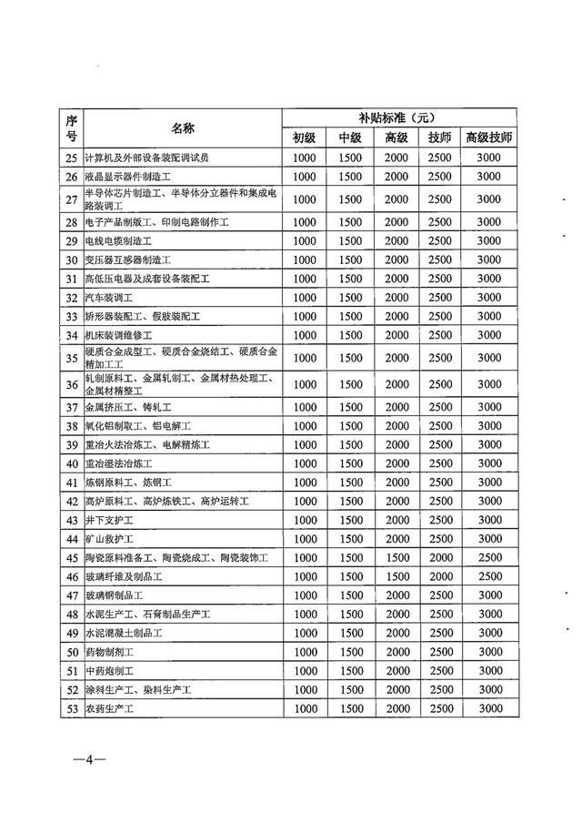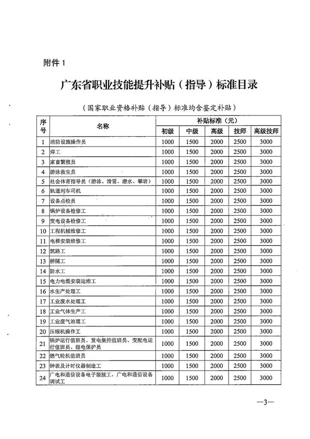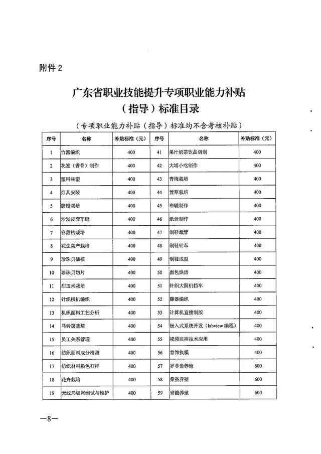 根据《广东省人力资源和社会保障厅广东省财政厅关于印发广东省劳动力职业技能提升补贴申领管理办法的通知》粤人社规〔2019]18号)、《广东省人力资源和社会保障厅广东省财政厅关于印发广东省职业技能提升培训补贴申领管理办法的通知》(粤人社规〔2019]43号 ),现将广东省职业技能提升各职业(工种)及专项职业能力补贴(指导)标准印发给你们,请遵照执行。