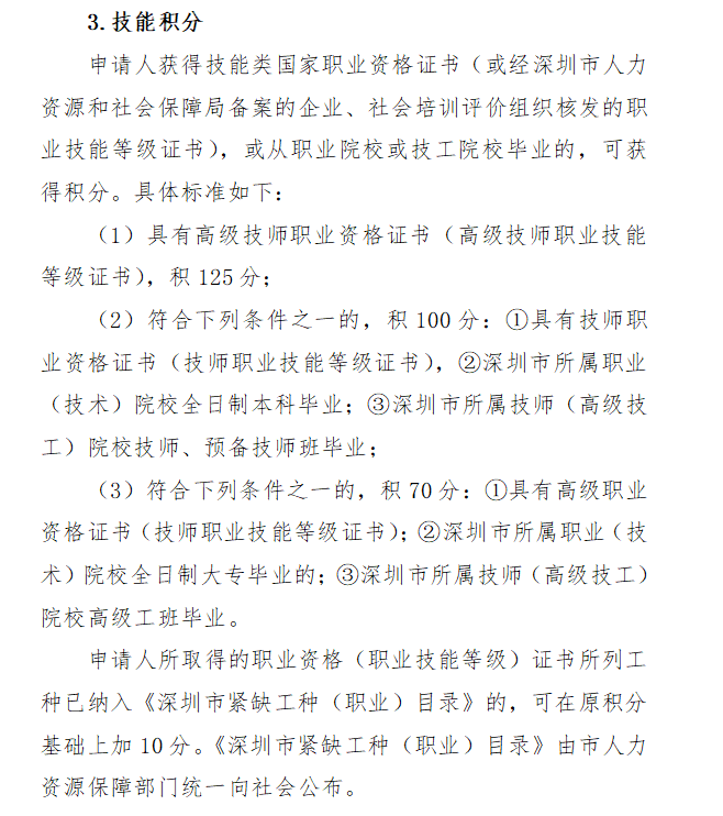 申请人获得技能类国家职业资格证书(或经深圳市人力资源和社会保障局备案的企业、社会培训评价组织核发的职业技能等级证书),或从职业院校或技工院校毕业的,可获得积分。